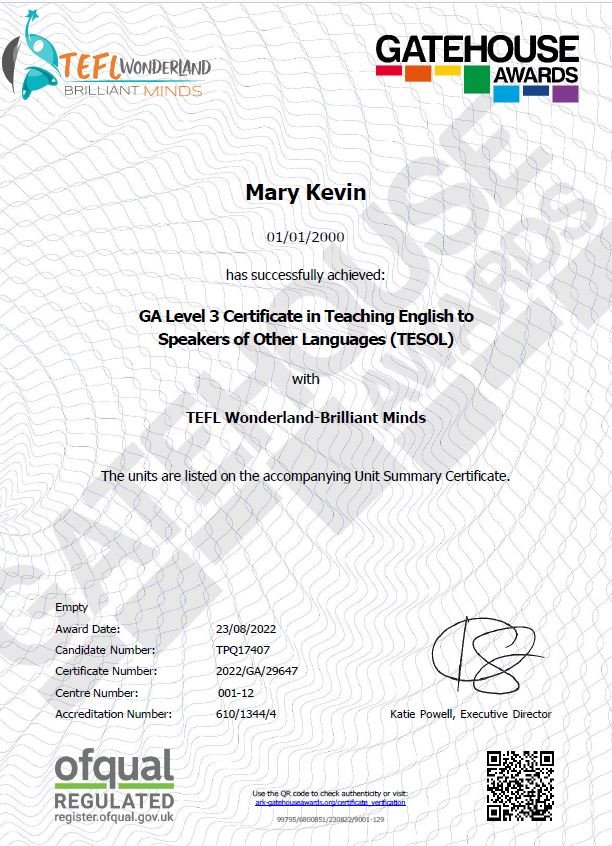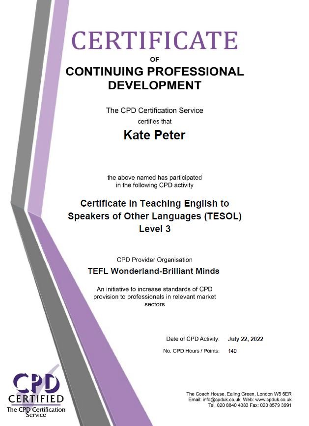 • Level 3 TESOL course certificate issued by TEFL Wonderland